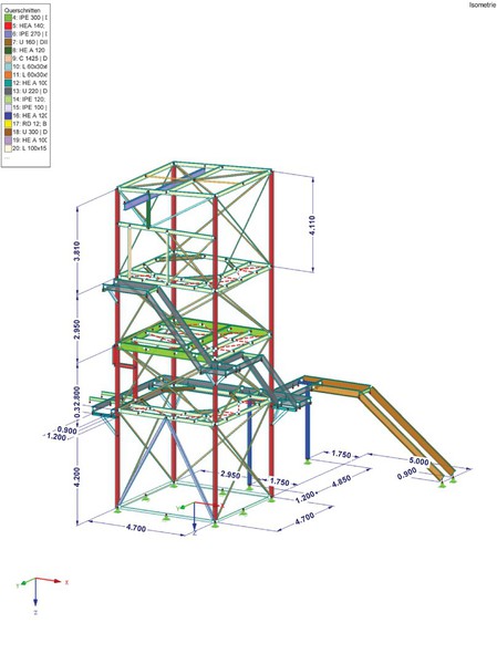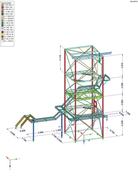 4-geschossiger Stahlbau mit Bühneneinbauten und Treppenanlage. Das Gerüst ist mit Trapezblechen vollständig eingehaust
