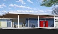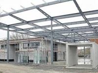 Erweiterung des Eingangsbereiches als Stahlkonstruktion mit Glasfassade und einem etwa 1,50m höher gelegtem, allseits etwa 4,0m auskragenden Flugdach - ebenfalls als Stahlkonstruktion mit Trapezblechdach.