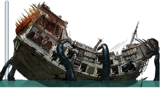 Die Achterbahn soll nach einem fast senkrechten Fall durch das Piratenschiff hindurchfahren, dieses wird augenscheinlich gerade durch mehrere Tentakel ins Wasser gezogen. Diese ca. 15 m hohe Attraktion ist ein Nachbau eines Schiffes aus einem bekannten Piratenfilm. Das Schiff besteht aus einer tragenden Stahlkonstruktion, die endgültige Schiffsform wird durch Holzelemente geformt. Die Einfahrt am Heck hat die Form eines großen, mit Zähnen gesäumten Maules. Die Heckpartie wird durch GFK-Elemente geformt, welches von einer filigranen Stahlrohrkonstruktion getragen wird.