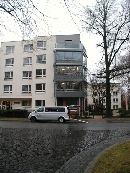 Bestand: Abriss der tragenden Außenwände in der Innendecke des Gebäudes auf ganzer Länge und Abfangung der vorhandenen Decken durch Stahlträger und -stützen. Lasteinleitung über Stahlbetondruckpolster in das verbleibende Mauerwerk des Erdgeschosses. Überbauung des Erdgeschossraumes.